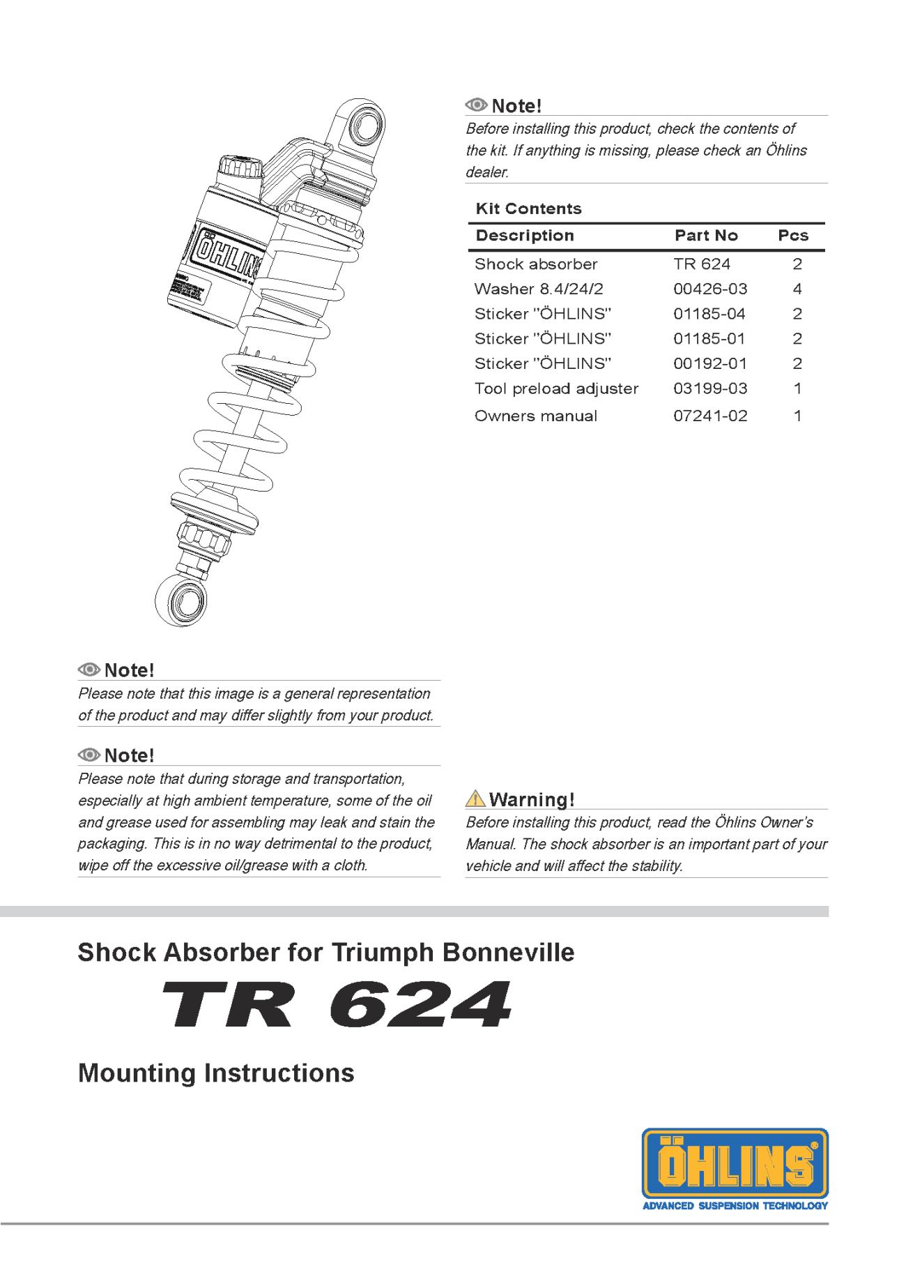 ● OHLINS có sản phẩn này phiên bản khác có hành trình hoạt động ngắn hơn không có bình dầu và ít chức năng hơn mã TR 634 (chi tiết tại đây)